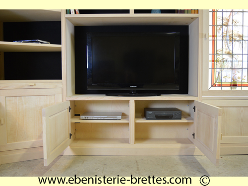 Un espace télévision est réservé au centre de la partie de droite. En dessous sont entreposés les box, lecteurs et autres périphériques. Au dessus de la télévision les espaces ouverts sont dédiés aux décors et aux livres. Les étagères sont parfois réglables par des taquets chromés et parfois fixes. Le client possédait un vitrail ancien qu'il souhaitait intégrer dans le meuble. Nous avons réalisé une porte adaptée aux dimensions du vitrail et aux proportions du meuble. A l'intérieur verres et bouteilles créent un espace bar.