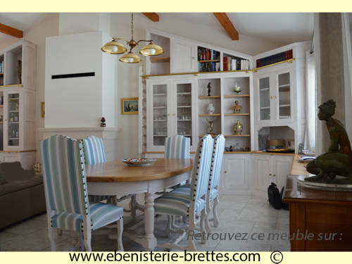 La bibliothèque de droite est constituée en partie basse d'une série de porte à ouverture par tirage à l'aide de bouton ovale en laiton. L'ensemble est posé sur un socle pour récupèrer le faux niveau du sol. Le dessus est en chêne vernis naturel pour trancher avec le blanc des façades.